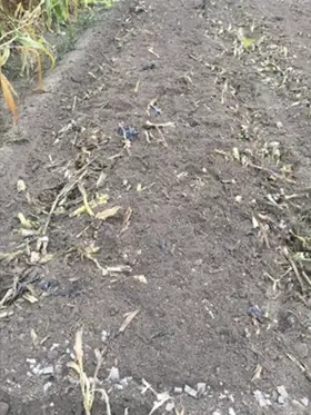 Fragments of soil biodegradable plastic mulch (BDM) are present on and in the soil, as expected, immediately after tillage (Photo by Prof. C. Miles).