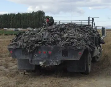 Typical post-season polyethylene (PE) mulch waste ready for transport to the landfill. (Photo by Prof. C. Miles)